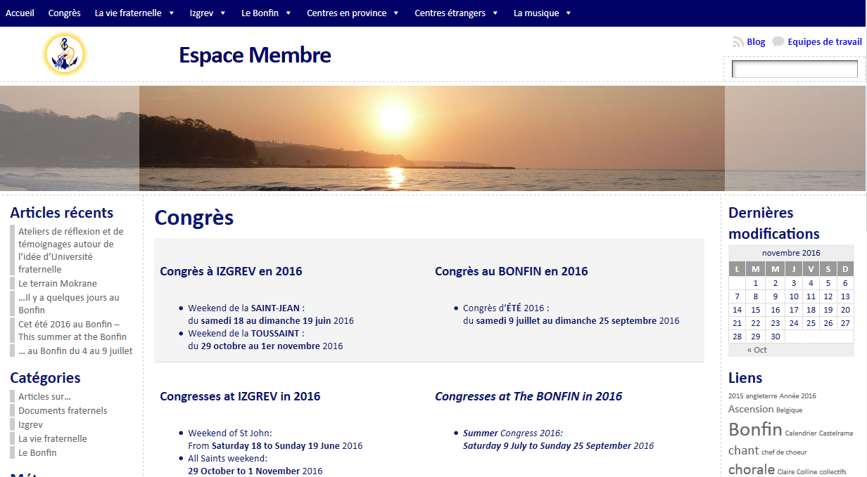 Dans l'espace membre, en ce moment... toutes les dates des réunions fraternelles dans les centres de province et les dates des prochains congrès, le 1er janvier 2017 : année anniversaire, des projets d'ateliers pour cet été au Bonfin, la musique, etc...