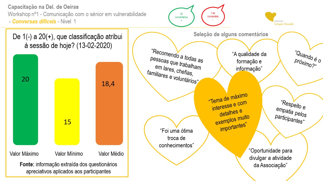 É com satisfação e orgulho que partilhamos convosco os resultados da implementação conjunta com a delegação de Oeiras, do primeiro workshop que promove a consciencialização de potenciais conversas difíceis com o idoso dependente e das possíveis abordagens que tanto o voluntário como o cuidador poderão considerar para uma interação de crescente saúde para ambos os lados da díade. Dificilmente esta imagem espelha a qualidade da atenção, participação e vontade de mitigar a solidão que se respirou em sala. Para este resultado, a Delegação de Oeiras esteve incansável, mas valeu a pena. Agora, vamos a caminho de Sintra. Dia 27 de Fevereiro, nos juntaremos às 14h30 na Paróquia de de Stªa Maria e S. Miguel para trabalhar o mesmo tema em conjunto. O alinhamento com Clarinda e Manuela Gonçalves já está em curso!