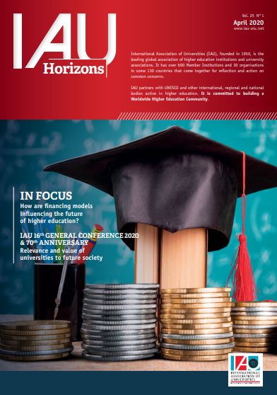 IAU is pleased to present the latest issue of IAU Horizons (vol. 25. No.1). This issue’s 'In Focus' section features 26 articles providing for a global perspective on How financing models are influencing the future of higher education. This theme was of key importance for Universities and HEIs pre COVID-19 pandemic and will be even more so in the medium and long term. These papers provide for a rich basis for future debates.