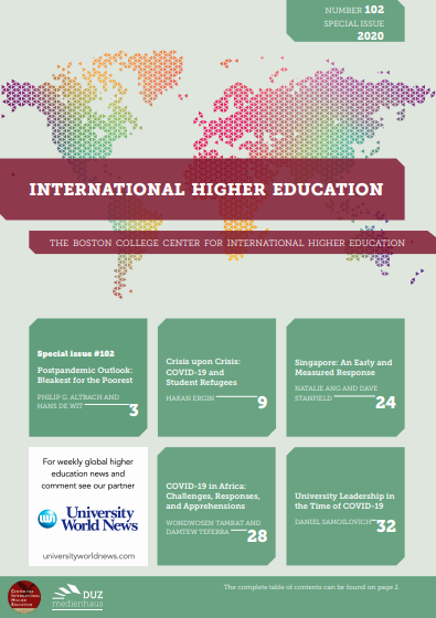 The Boston College Center for International Higher Education has released a special issue (#102) of the International Higher Education journal, published by DUZ, including IAU's contribution. This issue presents a global picture of Covid-19's impact in higher education. Challenges, responses to the crisis and opportunities in various world regions are discussed.