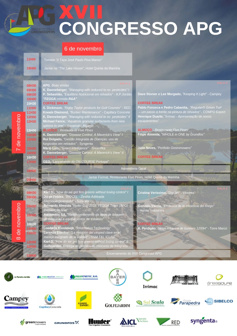 Já se encontram abertas as inscrições para o XVII Congresso APG, que se irá realizar nos próximos dias 6, 7 e 8 de Novembro, na Quinta da Marinha em Cascais. Este ano, para além de algumas novidades, iremos contar também com a presença de um convidado muito especial, o nosso conhecido Karl Danneberger.