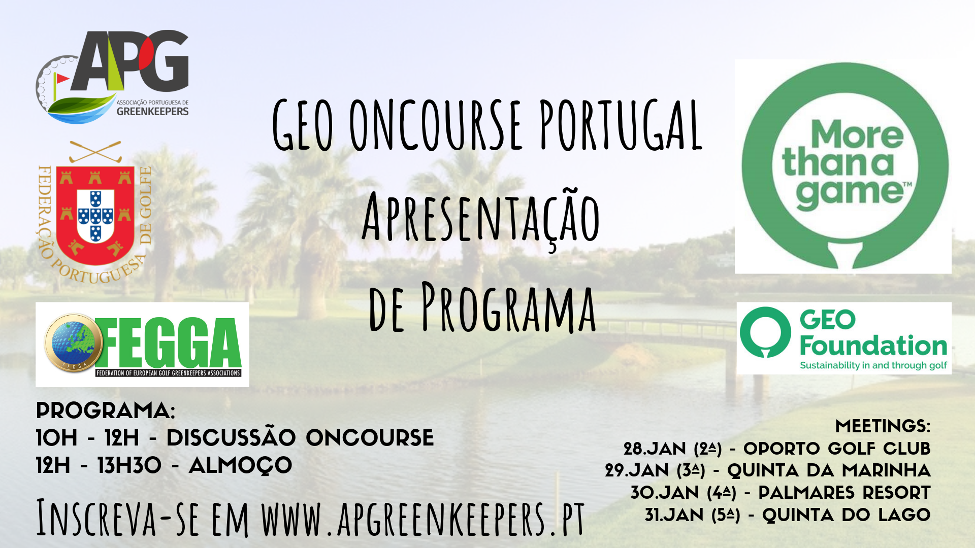 No próximo mês de Janeiro irão decorrer reuniões pelo pais com o intuito de apresentar o GEO OnCourse Portugal. Para além da presença da APG, GEO Fundation, FEGGA e da Federação Portuguesa de Golfe, gostaríamos de contar também com a presença dos greenkeepers portugueses. Para tal, basta clicarem