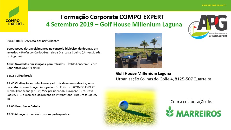 No próximo dia 4 de Setembro realiza-se mais uma formação Corporate, desta vez promovida pela COMPO EXPERT. A formação terá lugar no Golf House Millenium Laguna, pelas 9:30h. Para se inscrever basta clicar "AQUI" e preencher o formulário. A data limite para inscrições é ate ao dia 30 de Agosto.
