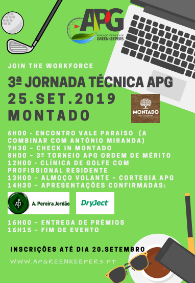 Hoje é o último dia para se inscrever na última Jornada Técnica APG de 2019!! Este evento realiza-se já na próxima quarta-feira e que terá lugar no campo de golfe do Montado, em Palmela!