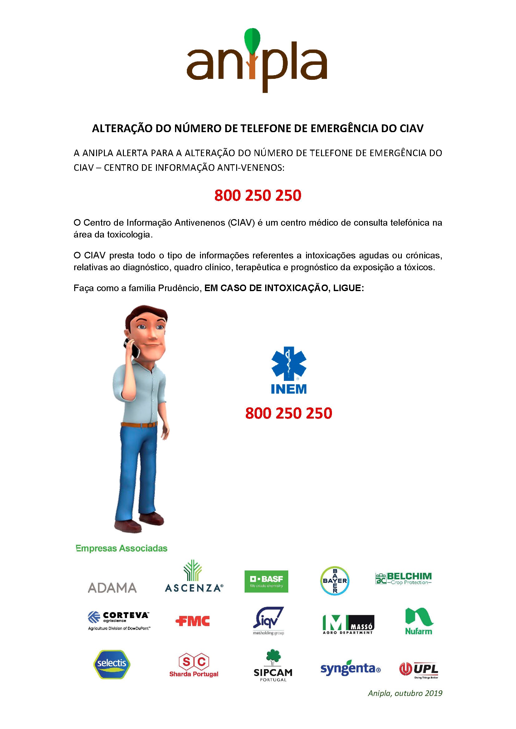 A Anipla e a APG informam que o número de telefone de emergência do CIAV (Centro de Informação Antivenenos) alterou. A partir de agora, em caso de emergência, por favor ligar para o 800 250 250.