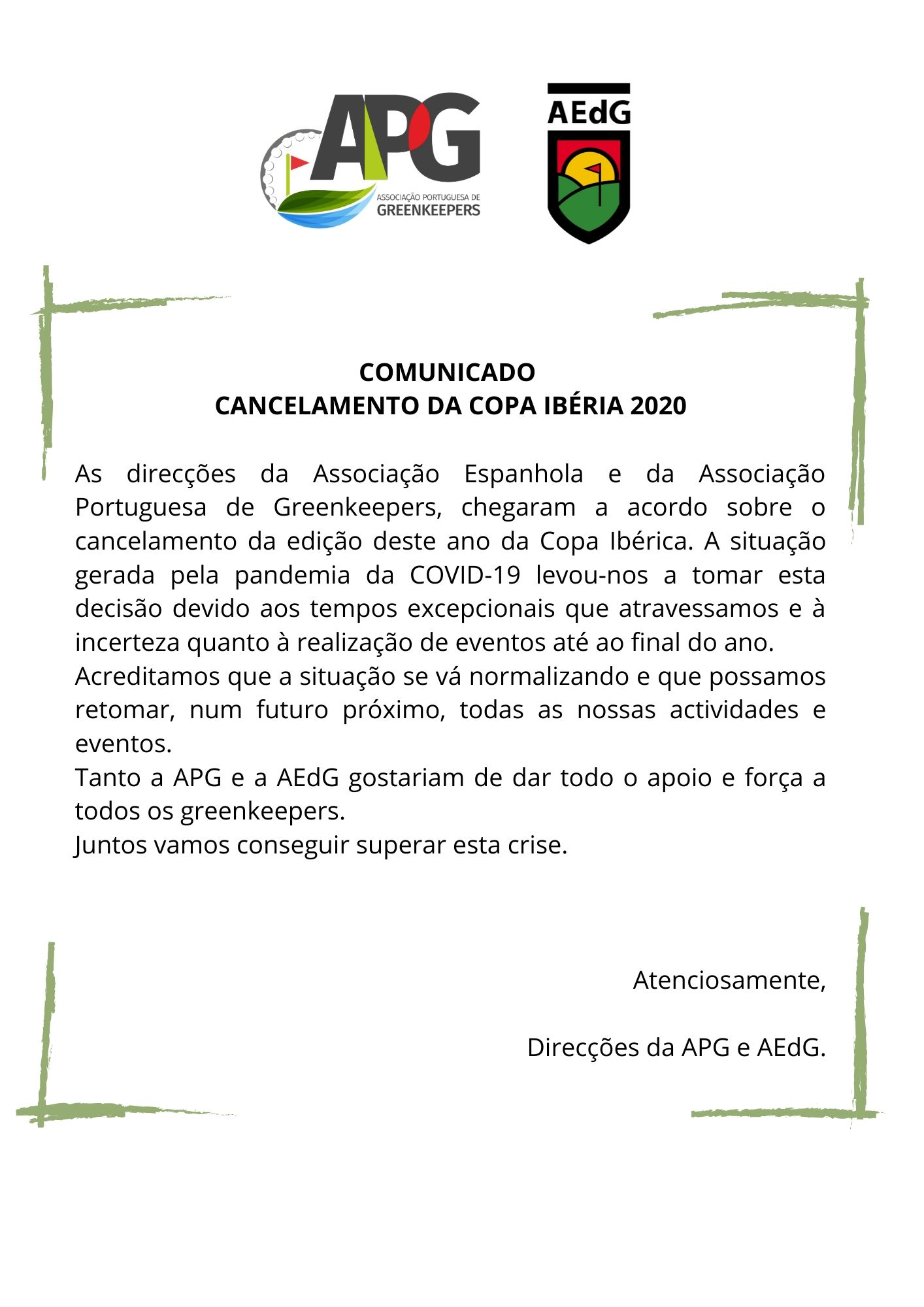 É com muita pena nossa que informamos que a XXII Edição da Copa Ibéria foi cancelada! A situação actual e os tempos que incerteza que vivemos, levaram as direcções da Associação Espanhola e Portuguesa de Greenkeepers a cancelar este evento. Neste momento, o importante é estarmos unidos e a apoiarmos a nossa industria e todos que fazem parte dela, esperando que tudo volte à normalidade rápidamente!