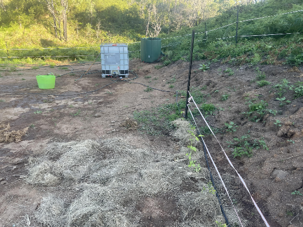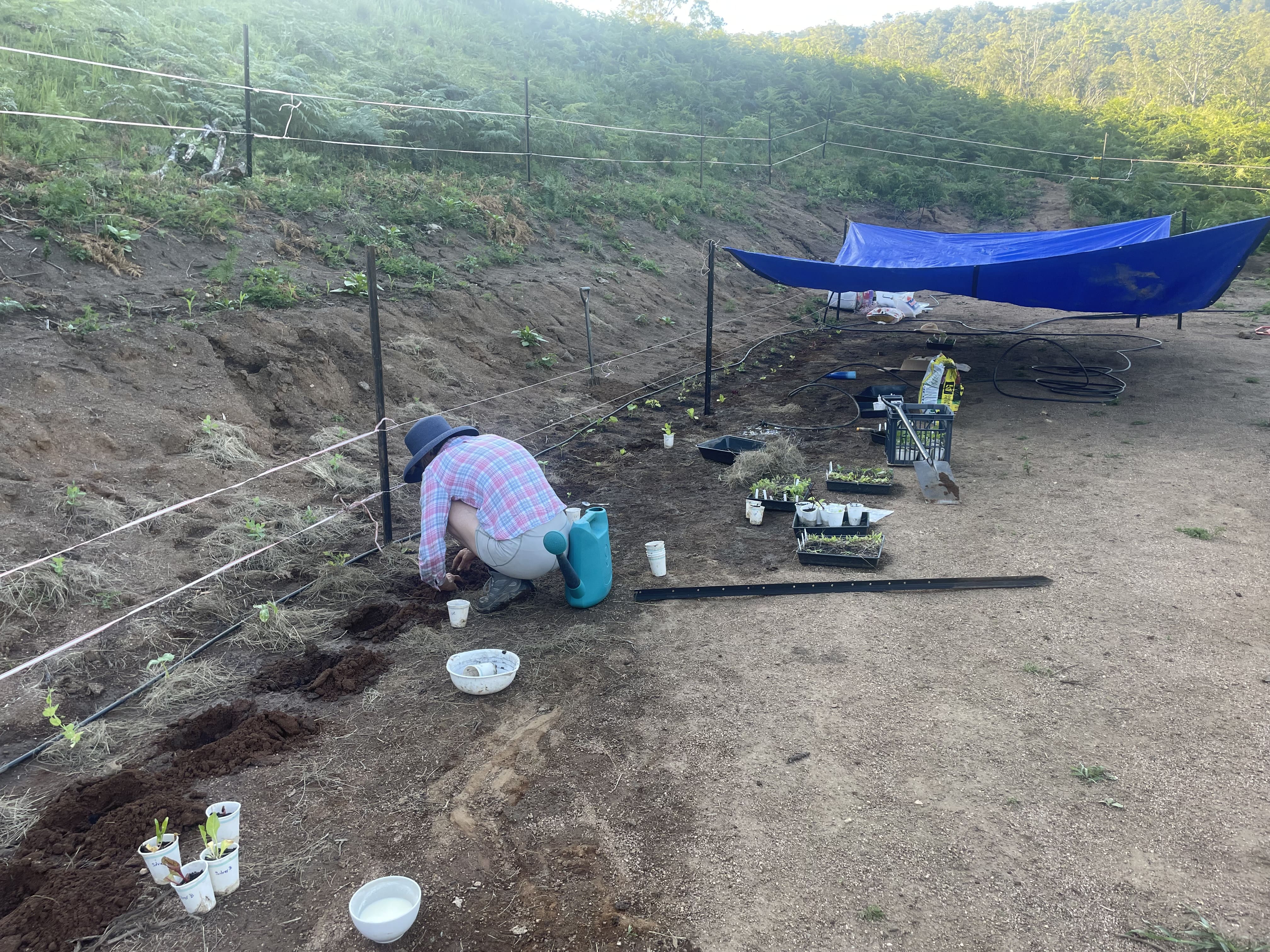 | | | | | MAHA have set up an automatically irrigated Plant Nursery in Tenterfield and as the plants mature we are taking them down to the Project and planting them Our first Woofer (Willing Worker On Organic Farms), dear Kerry has helped us enormously. Thanks dear Kerry. Very much appreciated On the MAHA site we have successfully piped water 400m down from the local pristine stream through ¾ inch agricultural piping and are obtaining 250 litres per hour via gravity feed (no pumps required) We have a 2 x 1000 litre tanks now full of water, and have laid 100’s of metres of 13mm pvc irrigation piping around the perimeter of our projected food forest Water is supplied to the plants via drippers and is currently timed via a battery operated irrigation timer for 10 minutes 3 times per day We are constantly upgrading our irrigation system Another current project is to erect a 3m tall by 6m long tarp covered green house made of 2 inch agricultural pipe bent into semi-circles and secured on star pickets over our temporary 10 person tent This will achieve two main aims: 1. To protect the tent from the elements. We had a huge storm a week ago. Very strong winds, thunder and lightning and 40mm of rain within an hour. Somehow our temporary tent survived. However, we may not be so lucky the next time around 2. To form a green house and allow us to plant in a green house environment