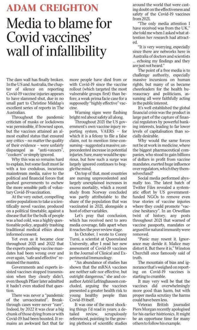 | As you may know, MAHA are going ahead with a Covid Class Action for all Australians in the Australian Federal Court Please scroll down to previous Newsletters (below) for more details The MAHA Class Action is a simple and very important case, exposing and proving the complete criminal fraud of the Covid Emergency and resulting Australian Federal and State Government actions, and is demanding compensation for all 26m+ Australians damaged by this shocking fraud This case will be Trial by Jury and will stand or fall on our production of Expert Witnesses and associated Expert Evidence As time goes by more and more evidence accrues showing this criminal fraudulent Covid Plandemic to be part of shocking criminal bio-warfare against all Australians and all of Humanity, by the USA Department of Defense, including forced injection of all people with poisonous lethal nanotechnology bio-weapons which contain microwave controllable nanobots to control humans, and mRNA DNA altering technologies which causes human cells all through our bodies to express artificial man-made poisonous spike proteins and anything else they care to make which create dysfunction in all organs, and lethal diseases Fertility rates have plunged in Australia since the introduction of these lethal poisonous ‘Covid’ injections. Miscarriages and Still births are rising alarmingly Believe it or not, these technologies have been secretly developed over the last two decades and more, by the USA Department of Defense. These are the ‘dual purpose’ and ‘gain of function’ technologies you’ve been hearing about with which Fauci and the NIH are deeply involved As we speak, these shocking forced injections are killing millions and maiming tens of millions across our Planet Criminally disguised as ‘Safe and Effective Covid Vaccines’ Death rates across the World and particularly in Australia have gone up more than 15% since these shocking forced injections were criminally mandated by Australian Governments Sounds like dystopian science fiction doesn’t it? However, shockingly, it’s TRUE MAHA have set up special databases to capture and store Expert Witness and Evidence data, and we are busy contacting Expert Witnesses all over the World to encourage them to give Expert Evidence Initially we are finding an excellent approach is to take expert evidence already published on the internet by experts, and format it as required in the correct Australian Federal Court Affidavit format MAHA then send out these affidavits to the Expert Witnesses to examine, complete and sign Here is an example http://bit.ly/435Lz24 We believe that the Expert Witnesses will be more than likely to sign these affidavits seeing that they have already widely published this information on line The expert information will also include multi-media, eg videos Additionally, MAHA are asking experts if they will consider appearing in person via AVL (AudioVisualLink) when the case goes to court which should be in the coming months MAHA’s job is not only to prosecute the criminal Australian Governments, but to awaken and educate Australians as to the shocking TRUTH of World Corruption and what’s going on right now! Thus we would encourage you to share this information widely The Federal Court Draft Affidavit document mentioned above, was sent to The Australian Newspaper on the 2nd of April and here is the (co-incidental?) article from Adam Creighton of The Australian the very next day, basically the first article criticizing the Australian Government and the Mainstream Media Covid censorship http://bit.ly/40GX1ja Many thanks |