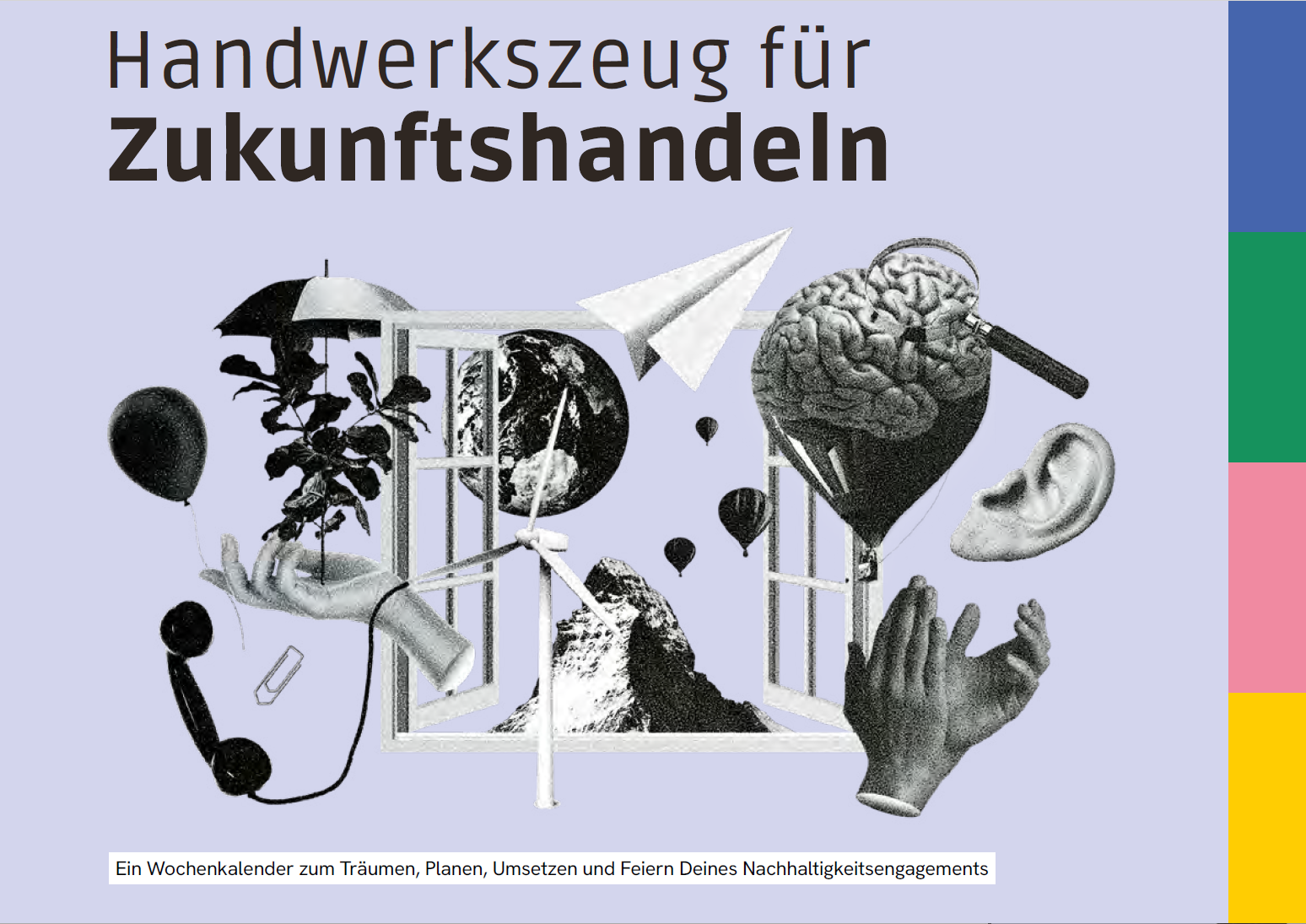 | Neues Material: Ausfüllbarer Projektkalender für Engagierte | Unser individuell ausfüllbarer Wochenkalender begleitet und unterstützt Interessierte und Engagierte über ein Jahr hinweg in ihrem transformativen Engagement für eine sozial gerechte und ökologisch nachhaltige Gesellschaft. Ihr findet darin Methoden, praktische Checklisten, strategische Tipps, kreative Ideen und Platz zum Pläne schmieden für die Planung & Umsetzung eigener Handabdruck-Projekte. Der Projektkalender baut auf unseren Erfahrungen sowie Workshop- und Konferenzinhalten aus dem gleichnamigen Programm "Handwerkszeug für Zukunftshandeln" auf. Ihr könnt den Kalender ab sofort für euer Engagement und eure Bildungsarbeit kostenlos bestellen. | | |