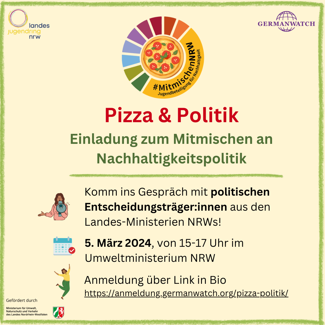 | Am 5. März von 15-17 Uhr bekommen junge Menschen in Düsseldorf die Möglichkeit sich mit Vertreter:innen aus allen Ministerien NRWs auszutauschen. Wenn ihr junge Menschen kennt, die für nachhaltige Themen brennen und ihre Ideen an die Menschen tragen wollen, die in den Ministerien für die Umsetzung zuständig sind, dann sind sie bei „Pizza & Politik“ genau richtig! Hier können sie mit politischen Entscheidungsträger:innen aus NRW über ihre Herzensthemen diskutieren und für eine gute und gerechte Zukunft einstehen. Leitet die Information zur Veranstaltung von #MitmischenNRW gerne an junge Menschen in eurem Umfeld weiter. |