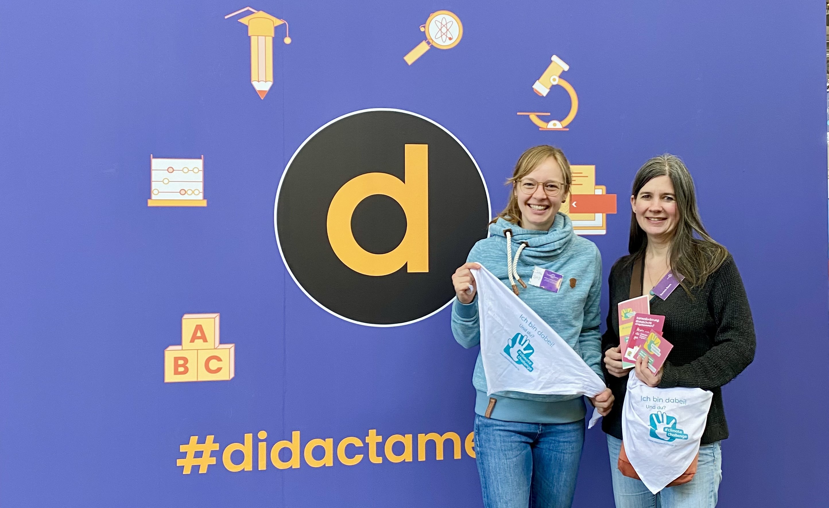 | Transformative Grüße von euerem Bereich Bildung für nachhaltige Entwicklung bei Germanwatch Zoe Hollmann, Marie Heitfeld, Stefan Rostock, Melanie Gehenzig, Carina Spieß, Daniela Baum, Katja Thiele, Aylin Lehnert, Greta Stein, Sofie Menke, Laura Michler und Pervez Ali Foto oben: Die BNE-Teamkolleginnen Carina Spieß und Daniela Baum als #climatechallenge-Botschafterinnen auf der Bildungsmesse didacta in Köln. |