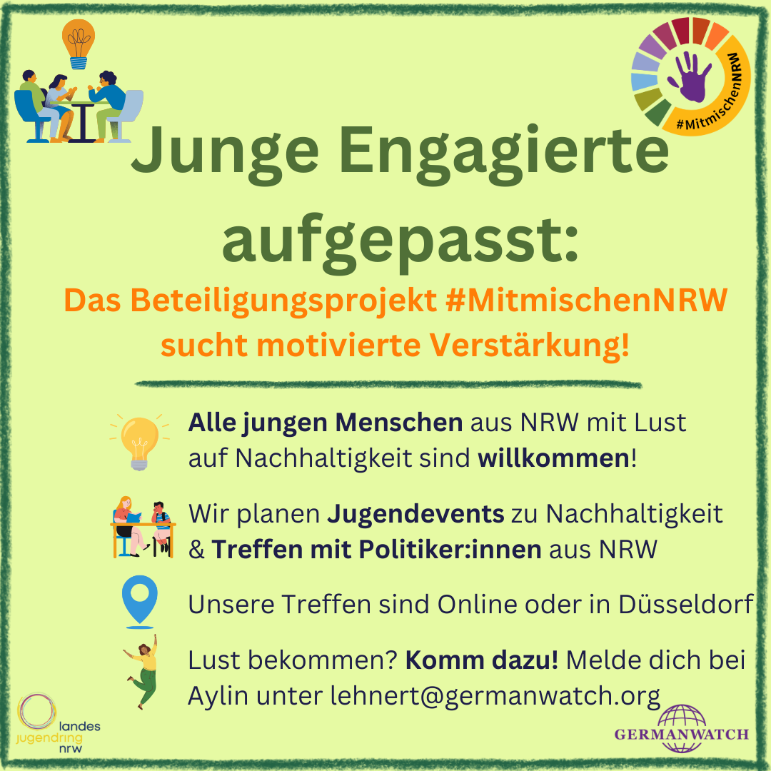 | Kennt ihr junge Engagierte aus NRW, die Lust haben im Jugend- beteiligungsprojekt #MitmischenNRW mitzuwirken? Dann leitet ihnen gerne diese Info weiter: Die Projektgruppe von #MitmischenNRW trifft sich 1x im Monat und plant gemeinsam Aktionen wie Workshops und Gespräche mit Politiker:innen. Das nächste Schnuppertreffen findet am 24. April von 17-19 Uhr im zeTT Düsseldorf statt. Interessierte können sich gerne bei Aylin melden (lehnert@germanwatch.org) und vorbeikommen! SAVE THE DATE: Am 17. & 18. August findet unser #MitmischenNRW Wochenende statt! Mehr dazu bald hier |