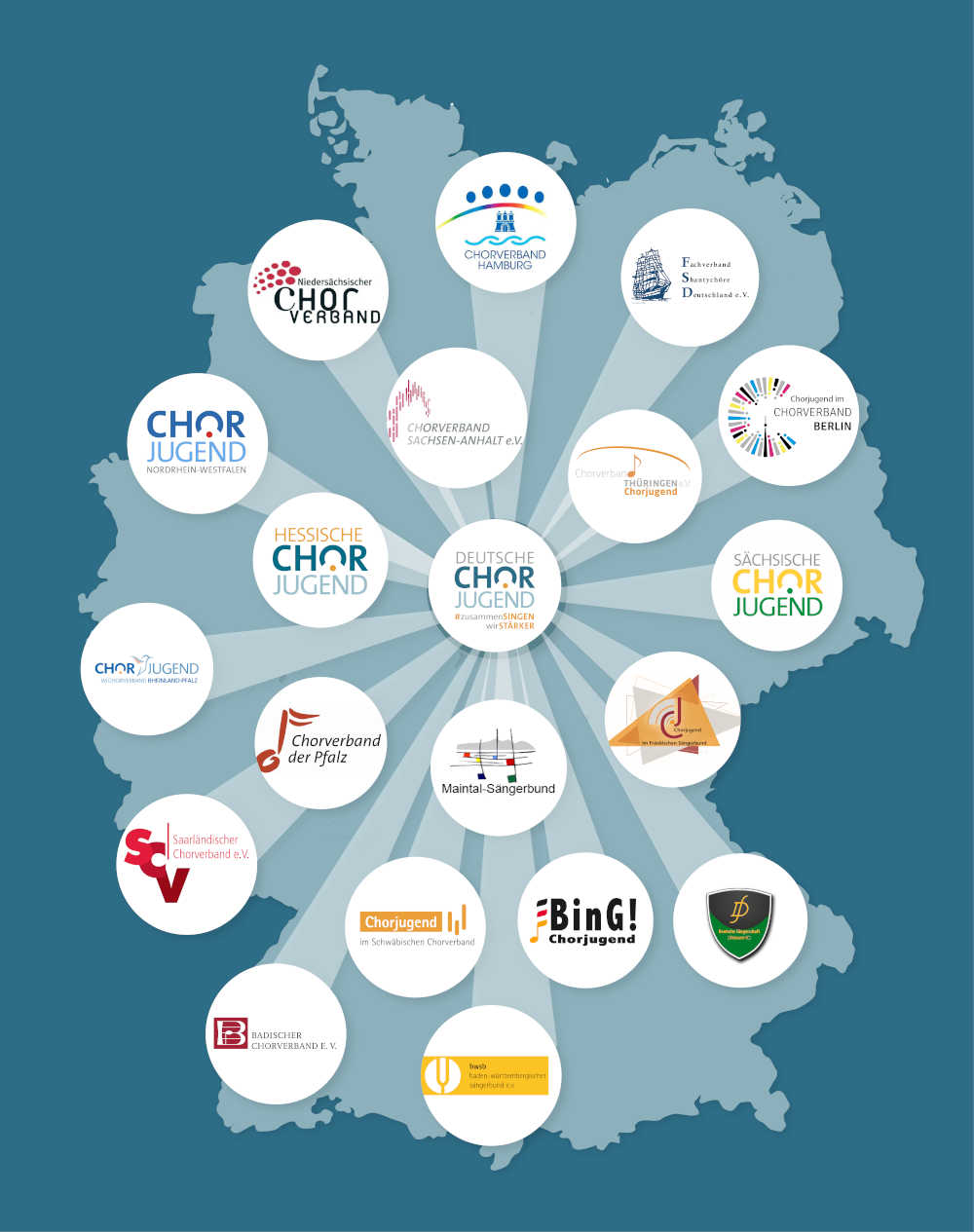 wir freuen uns sehr, mit dem heutigen Tag den DCJ-Newsletter ins Leben zu rufen. Als größe Interessensvertretung junger Sänger:innen in Deutschland möchten wir euch von nun an in regelmäßigen Abständen über Aktivitäten auf Bundesebene, News von unseren Programmen & Projekten, Fördermöglichkeiten, Veranstaltungen, Arbeitshilfen und vieles mehr informieren. Wir machen junge Stimmen stark und hörbar! Als Bundesjugendverband setzen wir uns auf allen Ebenen für die Belange singender Kinder und Jugendlicher ein. Wir fördern die musisch-kulturelle Bildung junger Menschen, Kinder- und Jugendbeteiligung, ehrenamtliches Engagement und den internationalen Austausch. Auf dieser Karte sind die Mitgliedsverbände der Deutschen Chorjugend bzw. des Deutschen Chorverbandes zu sehen. |